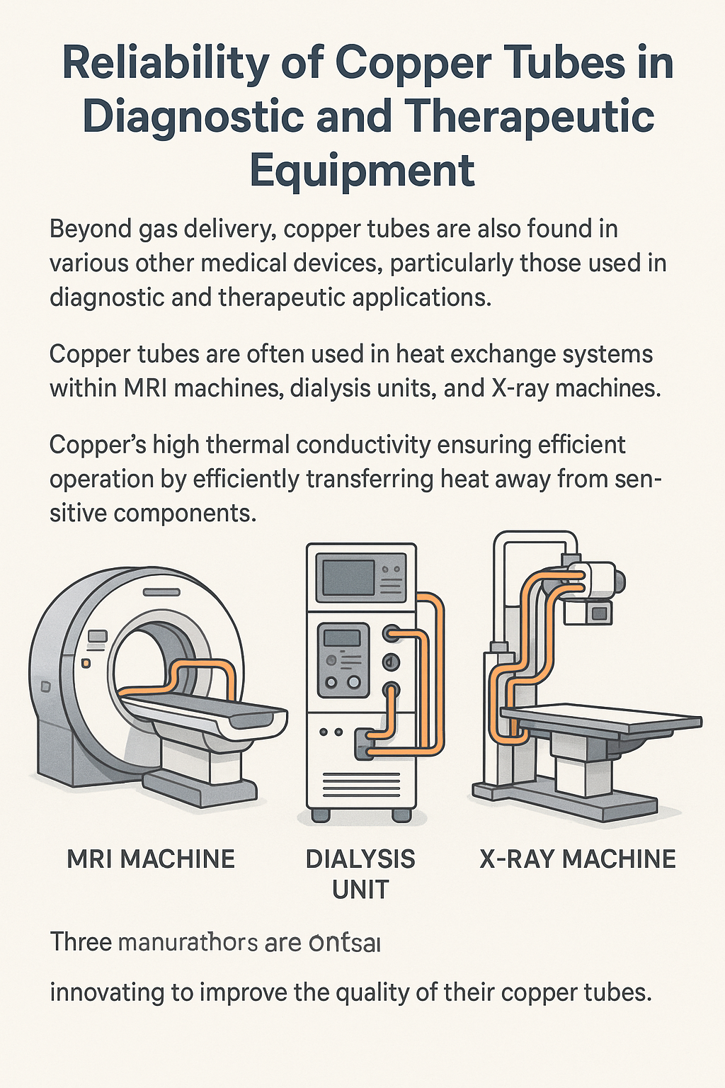 Okrem dodávky plynu sa medené rúrky nachádzajú aj v rôznych iných lekárskych zariadeniach, najmä v tých, ktoré sa používajú v diagnostické a terapeutické aplikácie . Napríklad medené rúrky sa často používajú v systémy výmeny tepla v zdravotníckych zariadeniach, ako sú prístroje MRI, dialyzačné jednotky a röntgenové prístroje. Vysoká tepelná vodivosť medi zabezpečuje, že tieto stroje fungujú efektívne a bezpečne tým, že efektívne odvádza teplo od citlivých komponentov.