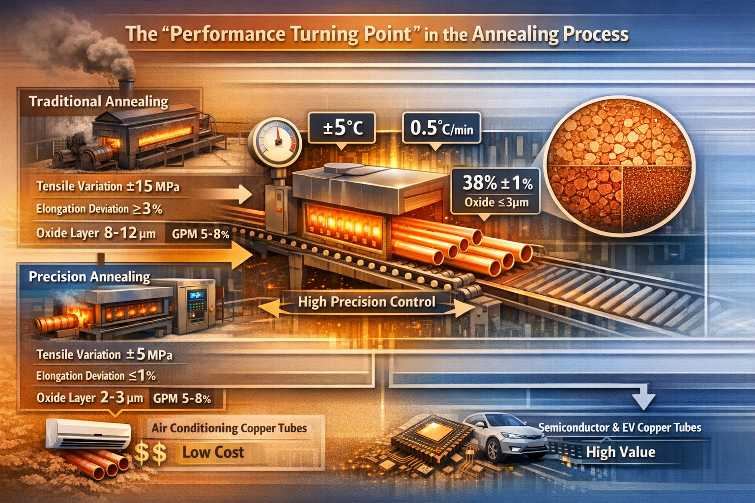 „Dokonca s tým istým medená rúrka V procese žíhania je pevnosť v ťahu produktov spracovaných našimi domácimi zariadeniami neustále nekonzistentná a húževnatosť je o 30 % horšia ako u výrobkov spracovaných dovezeným zariadením. Jednoducho nemôžeme prijímať špičkové objednávky na polovodiče a nové energetické vozidlá.“ Zhang, vedúci výroby v spoločnosti na výrobu presných medených rúr v Jiangsu, poukázal na dve žíhacie pece v dielni, čím zdôraznil problém v tomto odvetví. Proces žíhania, ako krok následného spracovania jadra pri výrobe medených rúrok, priamo určuje kľúčové výkonnostné charakteristiky, ako je húževnatosť, tvrdosť a tepelná vodivosť. To, čo vyzerá ako jednoduchá operácia „ohrievania a chladenia“, je v skutočnosti kľúčom k masovej výrobe špičkových medených rúrok. V súčasnosti sa väčšina malých a stredne veľkých výrobcov medených rúr v Číne stále spolieha na tradičné žíhacie zariadenia a empirické operácie, čo vedie k nedostatočnej stabilite výkonu produktu; niekoľko špičkových výrobcov si však pevne zabezpečilo trh špičkových objednávok využitím dovážaných presných žíhacích zariadení a technológie digitálnej regulácie teploty. Rovnaké suroviny medených rúrok v dôsledku jemných rozdielov v procese žíhania vedú k výrazne odlišnej konkurencieschopnosti produktov. toto " detailný proces “, ktorý väčšina spoločností prehliada, sa stáva neviditeľnou prekážkou, ktorá bráni čínskemu priemyslu medených rúr posunúť sa smerom k high-end trhu.