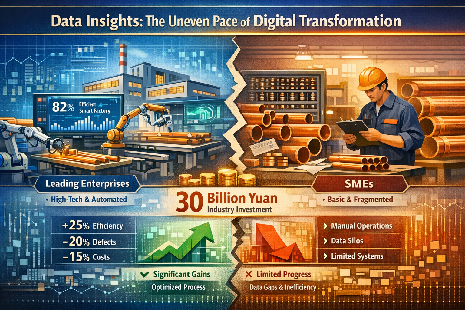 "Minuli sme viac ako 8 miliónov juanov na systém ERP a platformu na monitorovanie výroby, ale nakoniec sme naše papierové účtovné knihy presunuli online. Efektívnosť výroby sa príliš nezlepšila a dokonca to zvýšilo pracovné zaťaženie našich zamestnancov." Pán Wang, vedúci stredne veľkého medená rúrka spoločnosť v provincii Henan vyjadrila bežnú dilemu, ktorej čelí priemysel pri svojej digitálnej transformácii. Odvetvie medených rúr, poháňané iniciatívou „Made in China 2025“ a vlnou Industry 4.0, zaznamenalo prudký nárast úsilia o digitálnu transformáciu, pričom spoločnosti od popredných podnikov až po malých a stredných výrobcov výrazne investovali do inteligentných zariadení a digitálnych systémov. Realita je však taká, že väčšina spoločností je uväznená v cykle „veľkých investícií, malá návratnosť“, pričom digitalizácia zostáva povrchná; len niekoľko spoločností dosiahlo hlboké posilnenie a využilo digitalizáciu na prepojenie celého reťazca výroby, dodávateľského reťazca a služieb zákazníkom, čo viedlo k zníženiu nákladov a zvýšeniu efektívnosti. Na jednej strane stojí formalizmus „digitalizácie pre digitalizáciu“ a na druhej strane je tu efektívna transformácia „riadenia tvorby hodnôt prostredníctvom digitalizácie“. Prečo existuje taká polarizácia v digitálnej transformácii priemyslu medených rúrok? Skrýva sa za tým komplexná súhra kognitívnych predsudkov, technologickej adaptácie, podpory talentov a strategického plánovania, čo sa týka aj hlavnej hybnej sily pre kvalitný rozvoj priemyslu.