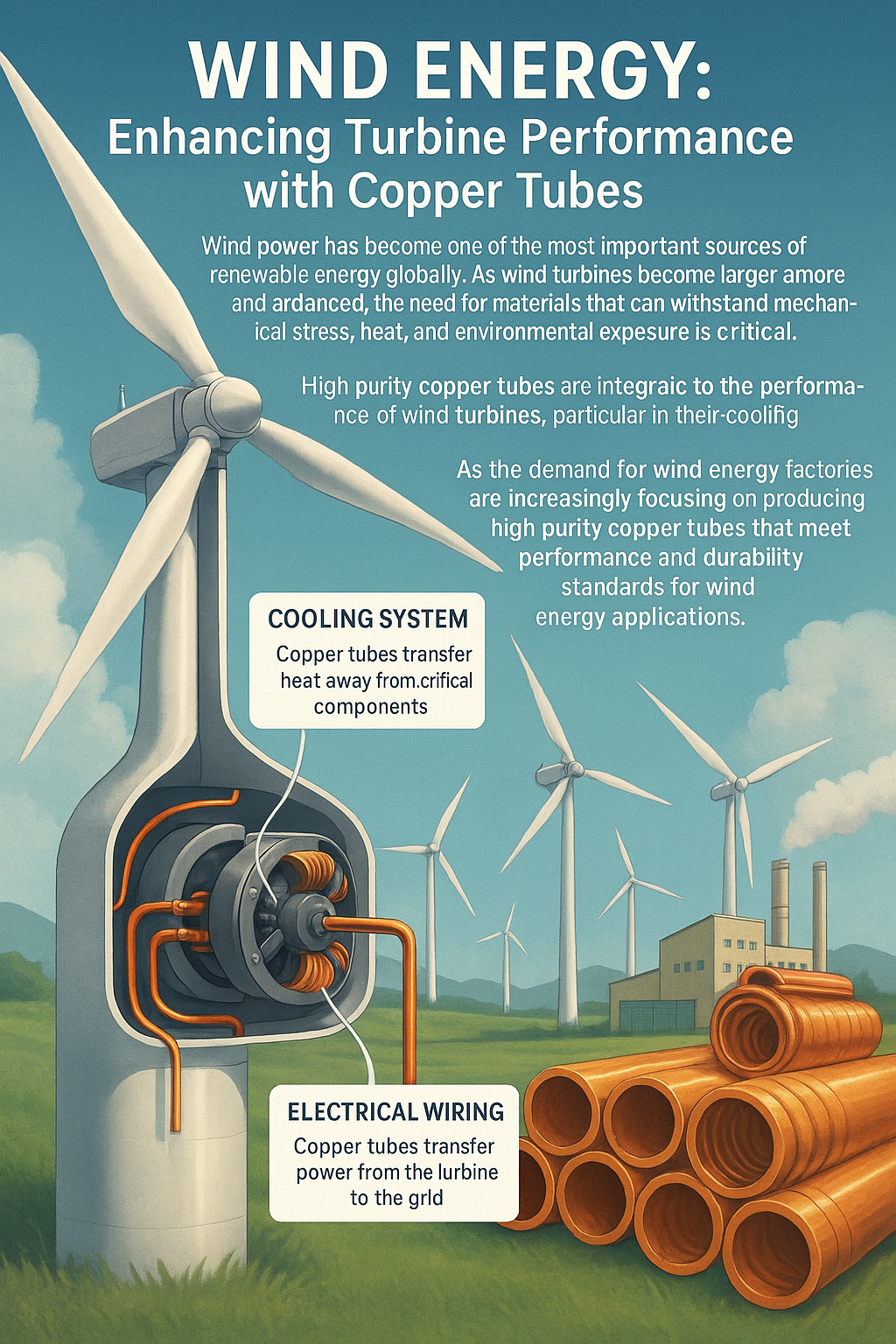 Veterná energia sa stala jedným z najdôležitejších zdrojov obnoviteľnej energie na celom svete. Ako sa veterné turbíny stávajú väčšími a pokročilejšími, potreba materiálov, ktoré odolajú mechanickému namáhaniu, teplu a vplyvu prostredia, je kritická. Medené rúrky vysokej čistoty sú neoddeliteľnou súčasťou výkonu veterné turbíny , najmä v ich chladiacich systémov a electrical components.