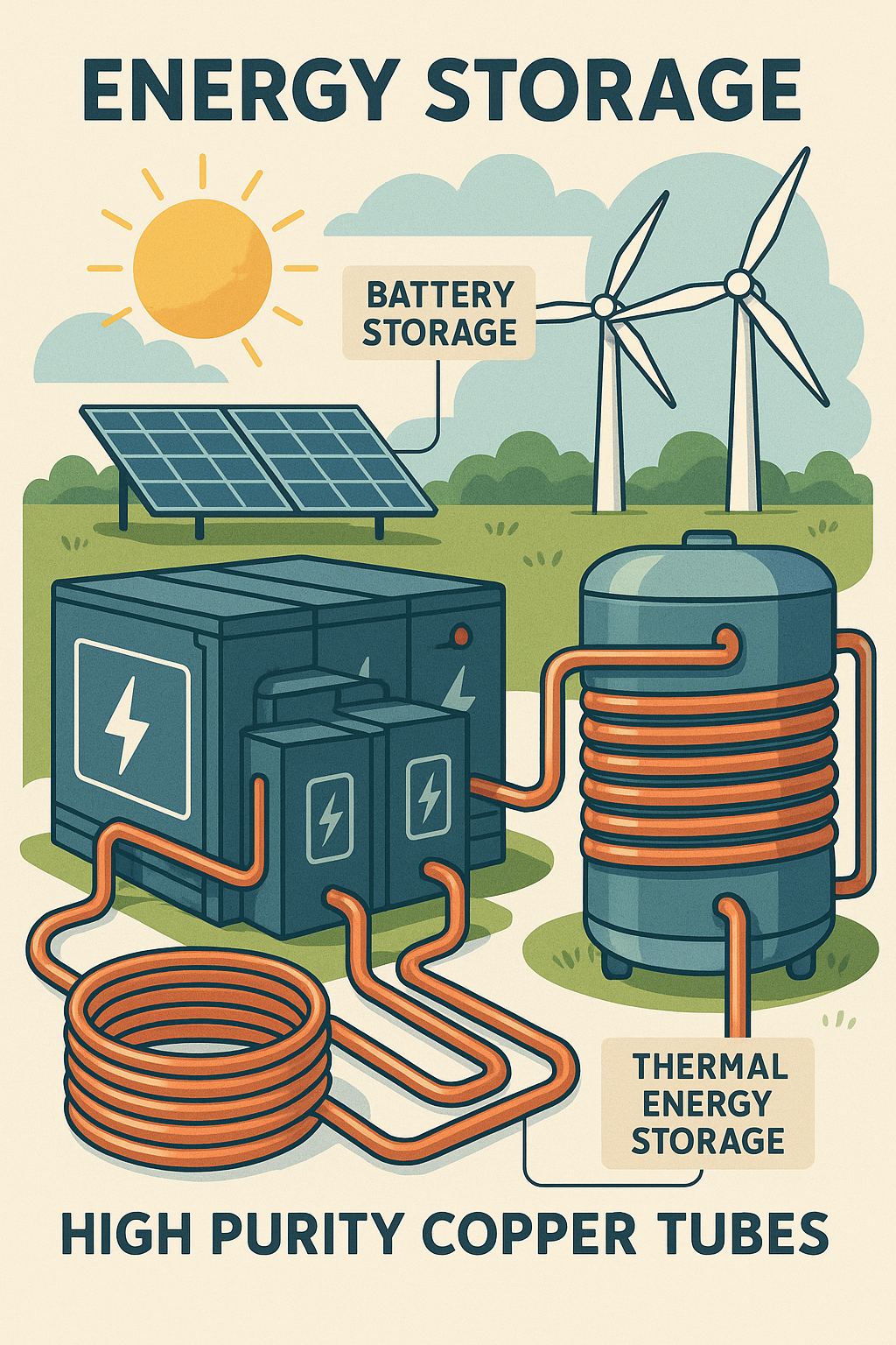 Skladovanie energie je kritickou zložkou infraštruktúry obnoviteľnej energie, ktorá pomáha vyrovnávať prerušovaný charakter zdrojov, ako je slnečná a veterná energia. Medené rúrky vysokej čistoty sa používajú v rôznych systémoch skladovania energie, vrátane batérie a tepelné akumulačné systémy . Tieto systémy vyžadujú komponenty, ktoré dokážu efektívne riadiť teplo a elektrinu, aby sa zabezpečil spoľahlivý výkon.