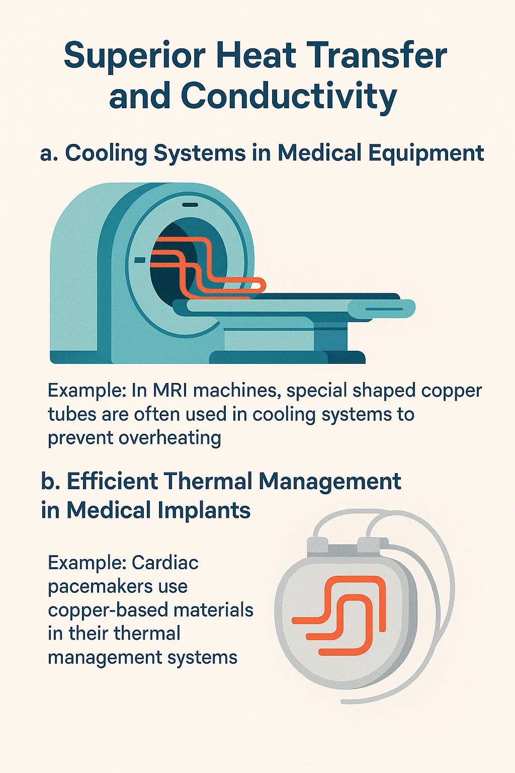Meď je preslávená vynikajúca tepelná vodivosť , čo z neho robí ideálny materiál pre aplikácie, ktoré vyžadujú výmena tepla . Špeciálne tvarované medené rúrky využiť túto vlastnosť v rôznych zdravotníckych pomôckach, najmä v chladiacich systémov or výmena teplars .